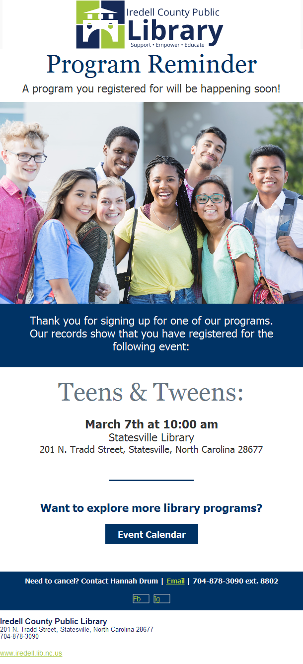 Walk-ins for programs are great. But, requiring registration allows your library to ask for an email address. Then, you can send program reminders like this one from Iredell County Public Library.