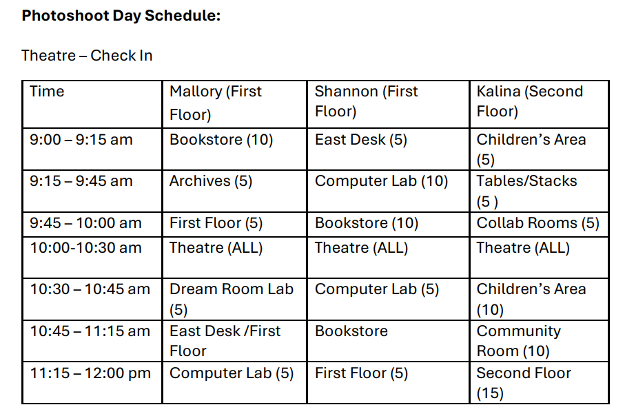 Brianna and Samantha agreed to share their photoshoot day schedule for any library wishing to replicate this process, as well as their wish list of shots and their prop list.