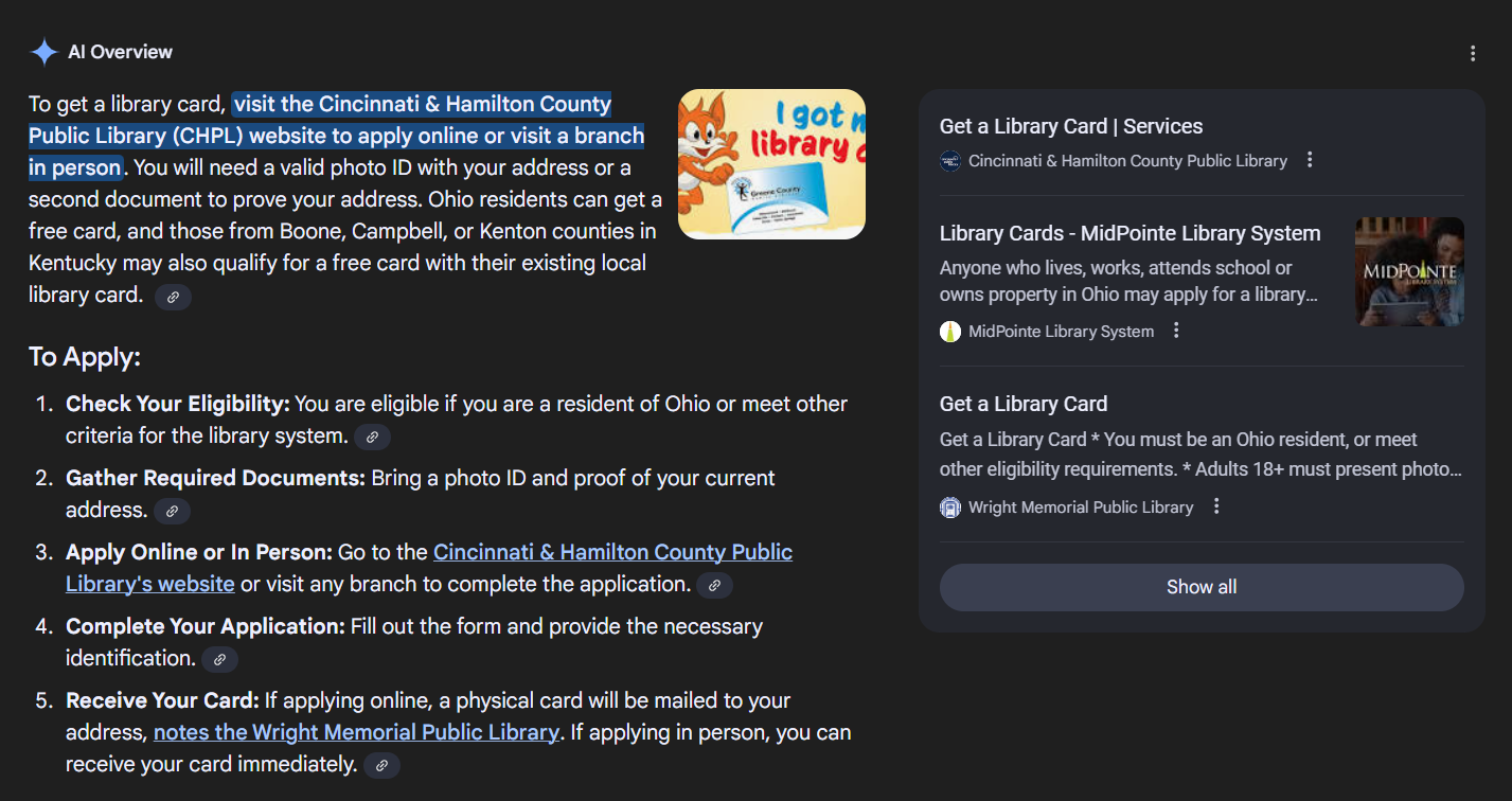 Once AI Overviews were introduced, searchers stopped clicking through to a website because their question was fully answered by the AI Overview. As a result, many libraries (and other websites, including this one) noticed a decrease in their organic web traffic.