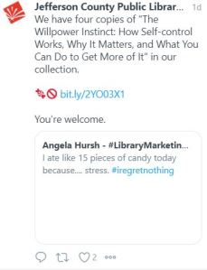 Kudos: Finally, I gave a shout-out to my friends at the Jefferson County Public Library for this hilarious and clever response to my stress-related tweet on Tuesday! I laughed all night!