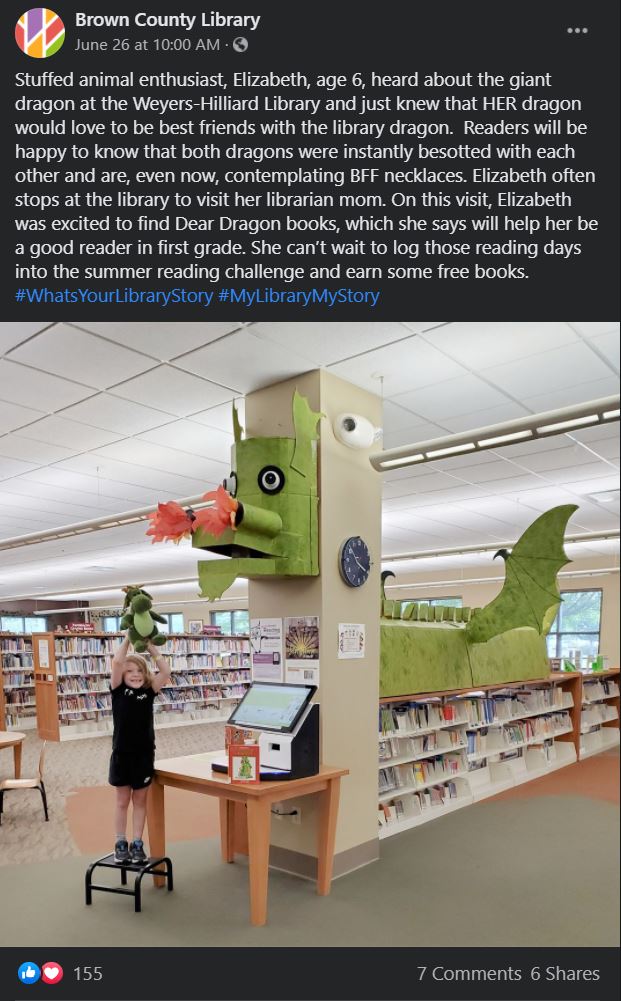 The Brown County Library works content marketing into its Facebook page posting schedule. They’ve even created a hashtag, #WhatsYourLibraryStory to drive engagement.