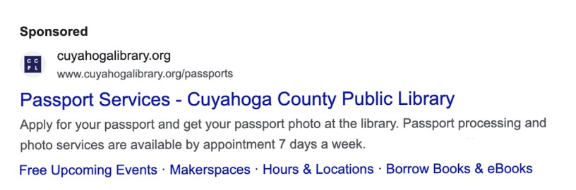 A sample Google ad for Passport Services at Cuyahoga County Public Library in Ohio.